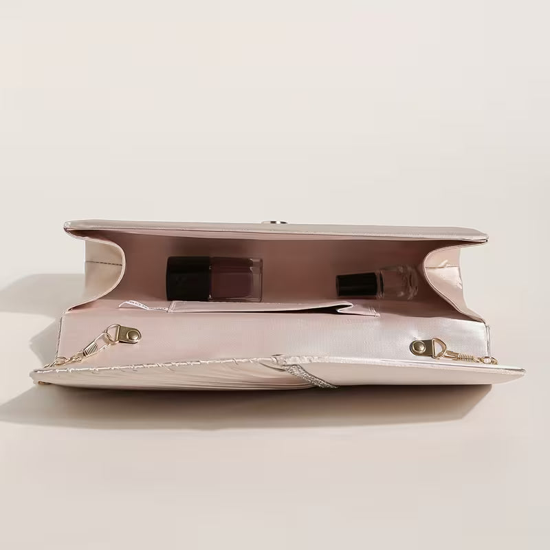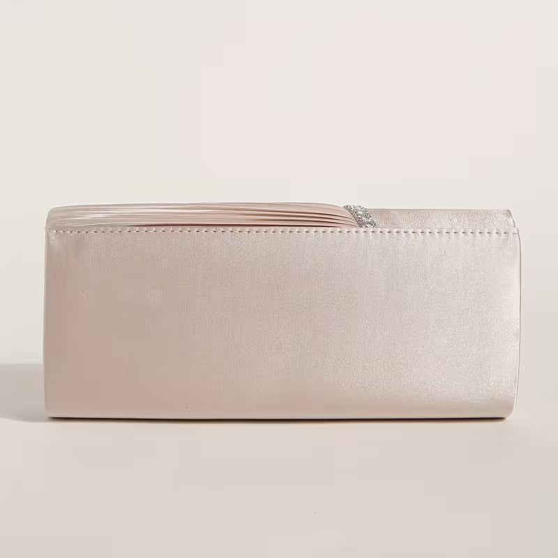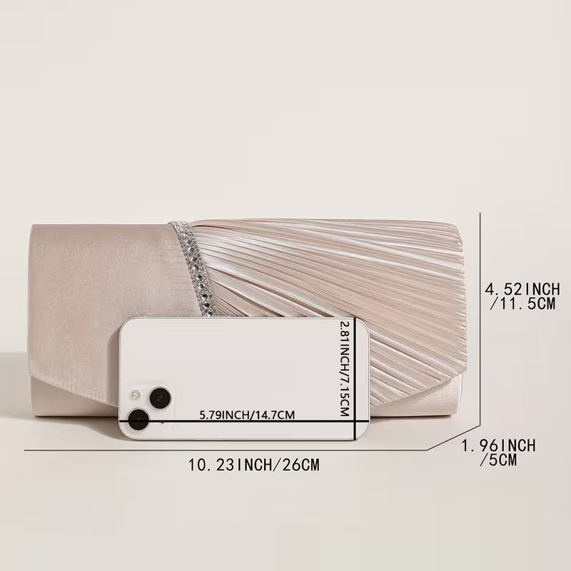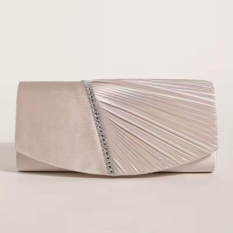 Champagne/Nude Rhinestone-Embellished Pleated Clutch Evening Bag
