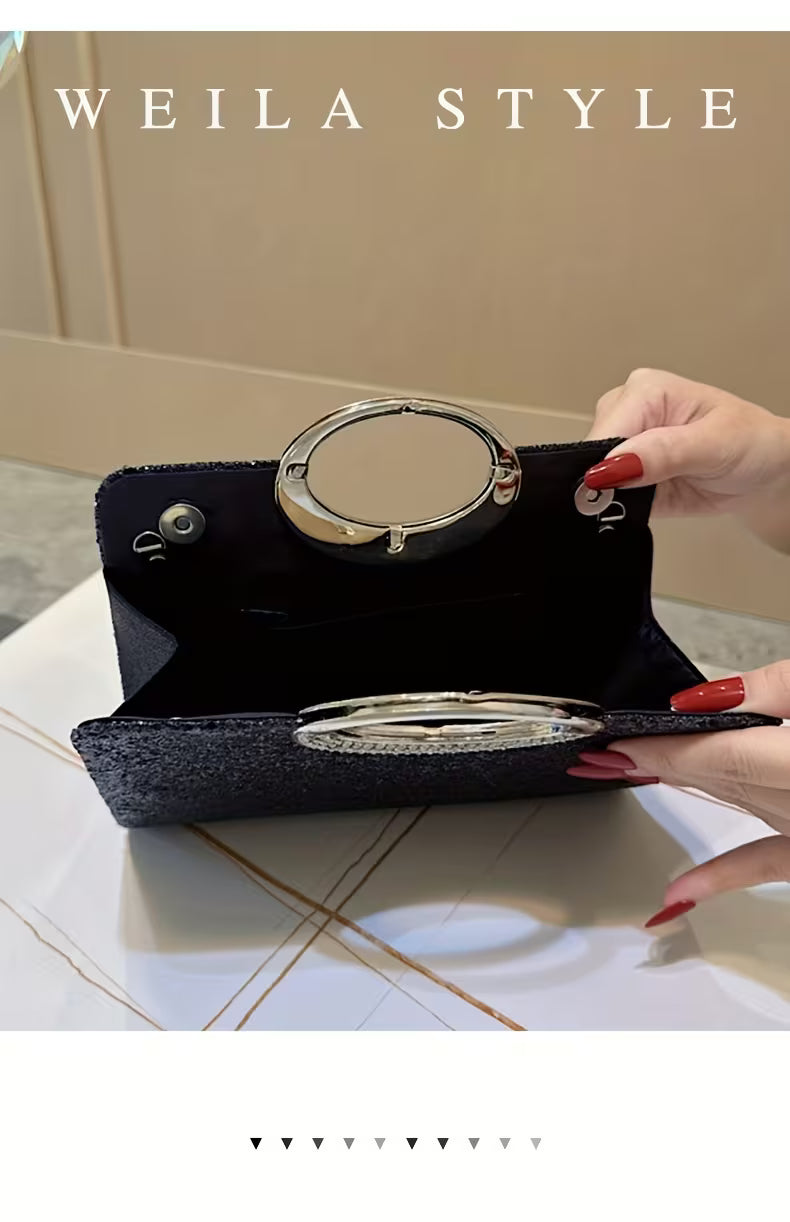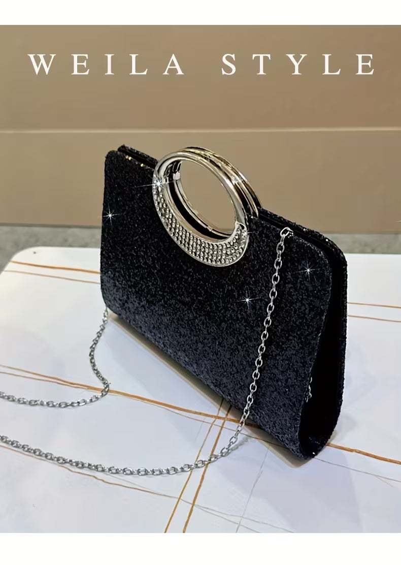 Luxurious Black Glitter Clutch with Rhinestone Handles